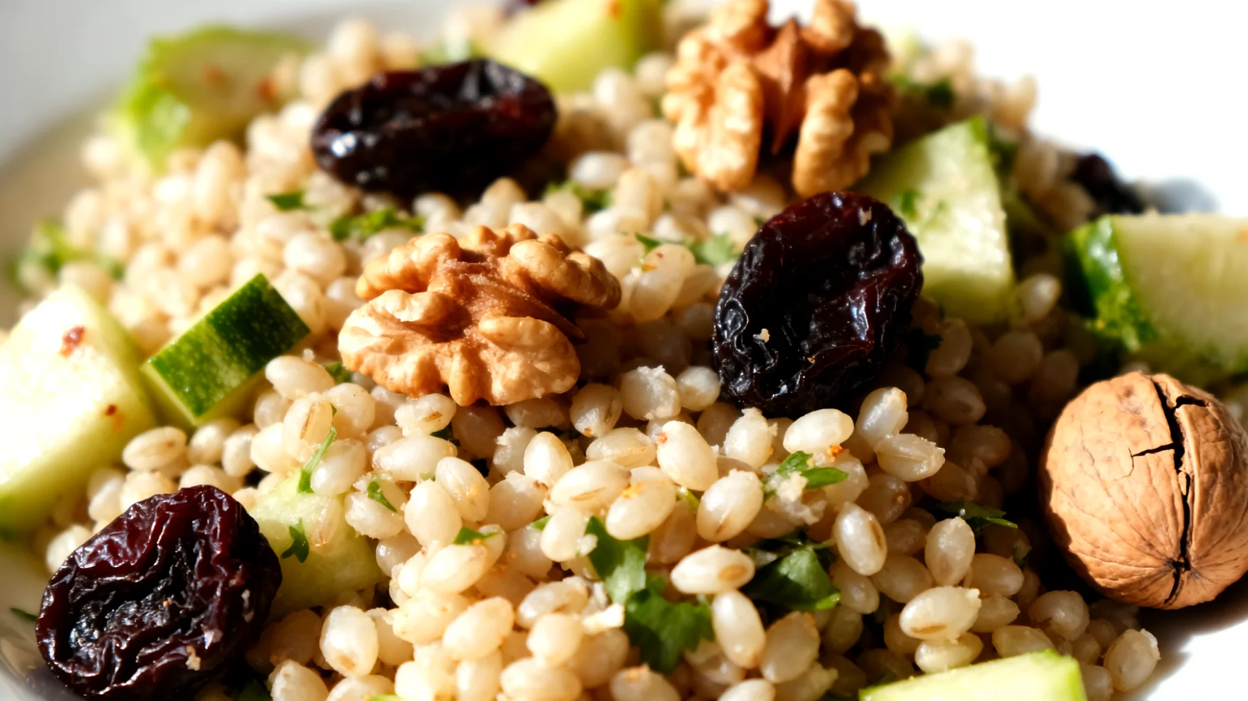 Questo piatto si presta perfettamente alla meal prep. L’orzo può essere cotto la sera precedente e conservato in frigorifero, le verdure tagliate e riposte in contenitore separato per mantenere la croccantezza, mentre noci e prugne possono essere aggiunte al momento. Trasportato in un contenitore ermetico, resta fresco e appetitoso fino all’ora di pranzo.